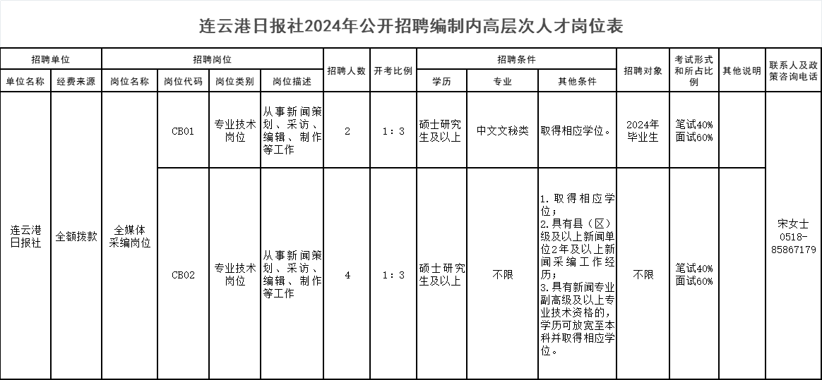 具体岗位及招聘条件等详见《连云港日报社2024年公开招聘编制内高层次人才岗位表》(附件1,以下简称《岗位表》)。《岗位表》可在连云港党建网(http://www.lygdj.gov.cn/)、连网(http://www.lyg01.net)查询、下载。